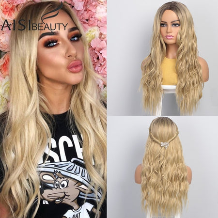 AISI BEAUTY Long Womens Wigs Ombre Platinum Blonde Wigs Heat Resistant Part Side Synthetic Wavy Wigs for African American Women