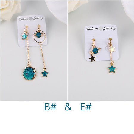 Korea Style Asymmetrical Fresh Enamel blue Star Moon Planet Circle Clip on Earrings Non Pierced For Girl Women Party Gift